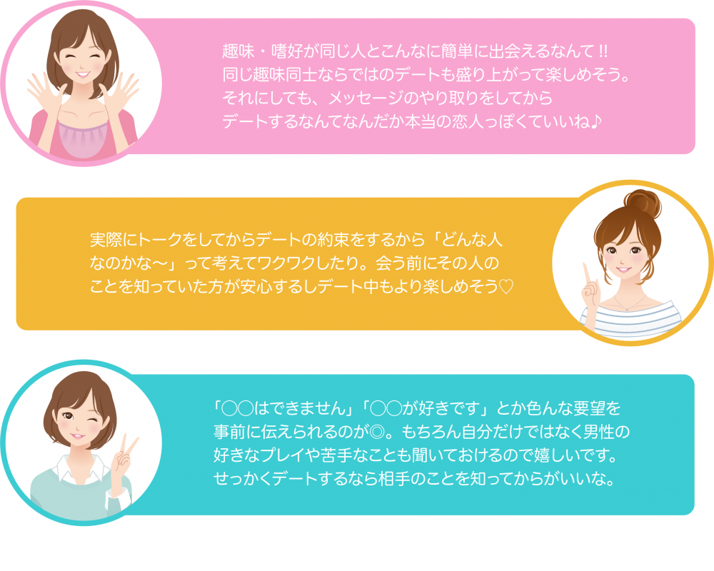 ほかにも、気になる女の子に「いいね」アタックや直接トークできるラブレター機能、フェチ・趣向で意気投合するフェチタウン、お互いの予定日が一致した場合に届くマッチング通知、自由に投稿できるリクエスト告知版やお気に入り機能など、理想のお相手とマッチングするための豊富な機能が満載!