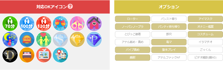 これは、デリ活ページの個人ページに載っている対応可能アイコンと、対応可能オプションです!