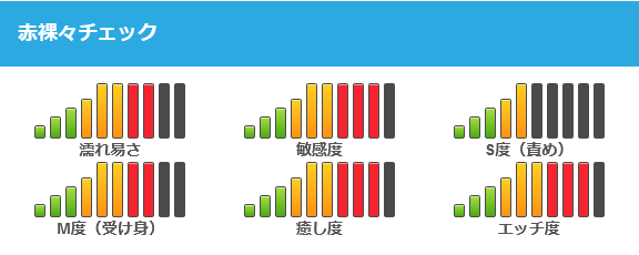 全体的に8~9で高めとなっておりますが、エッチ度、癒し度、敏感度は90点☆