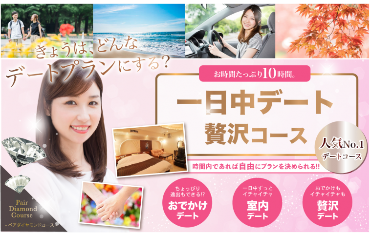 一日デートコースは、たっぷり10時間、自分の好きなプランで遊べる贅沢な大人気コースです。