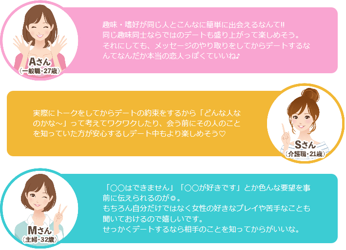 マッチングが成立したら女性とのトークをとことん楽しみましょう。お互いの趣味や好みのタイプ、お好きなプレイ、ちょっとエッチなお話など何でもご自由にお話しください。もちろんトーク回数の制限などはなく完全無料でお楽しみいただけますので、気が済むまで女性とトークできます♪お一人だけではなく色んな女性とのトークをたっぷりお楽しみくださいね。