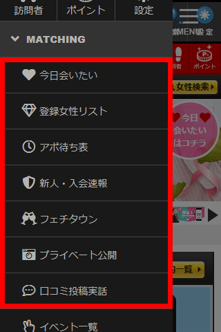マイページの右上にある「詳細検索」から年齢、身長、雰囲気、エリア、体型、婚姻歴などを選び、自分の好みに合った女性を見つけることができます。どんな女性がいいのか、細かい理想像まで決定しているのであればこちらの検索方法がおすすめです。ログイン状態であれば右上の「検索」タブから下記の画面を表示できます。