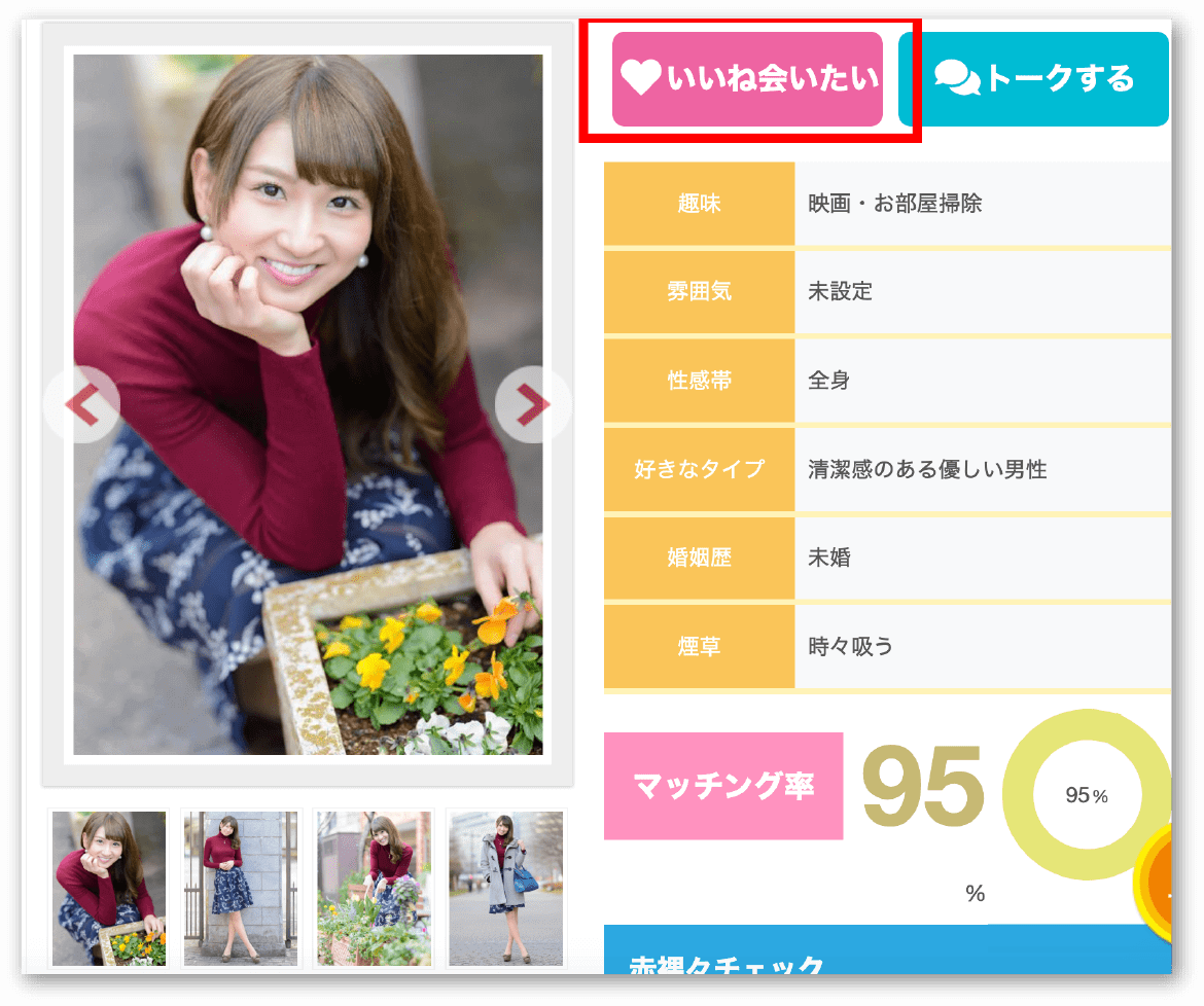 女性のプロフィールページにある「いいね会いたい」ボタンを押せば「いいね」完了です。