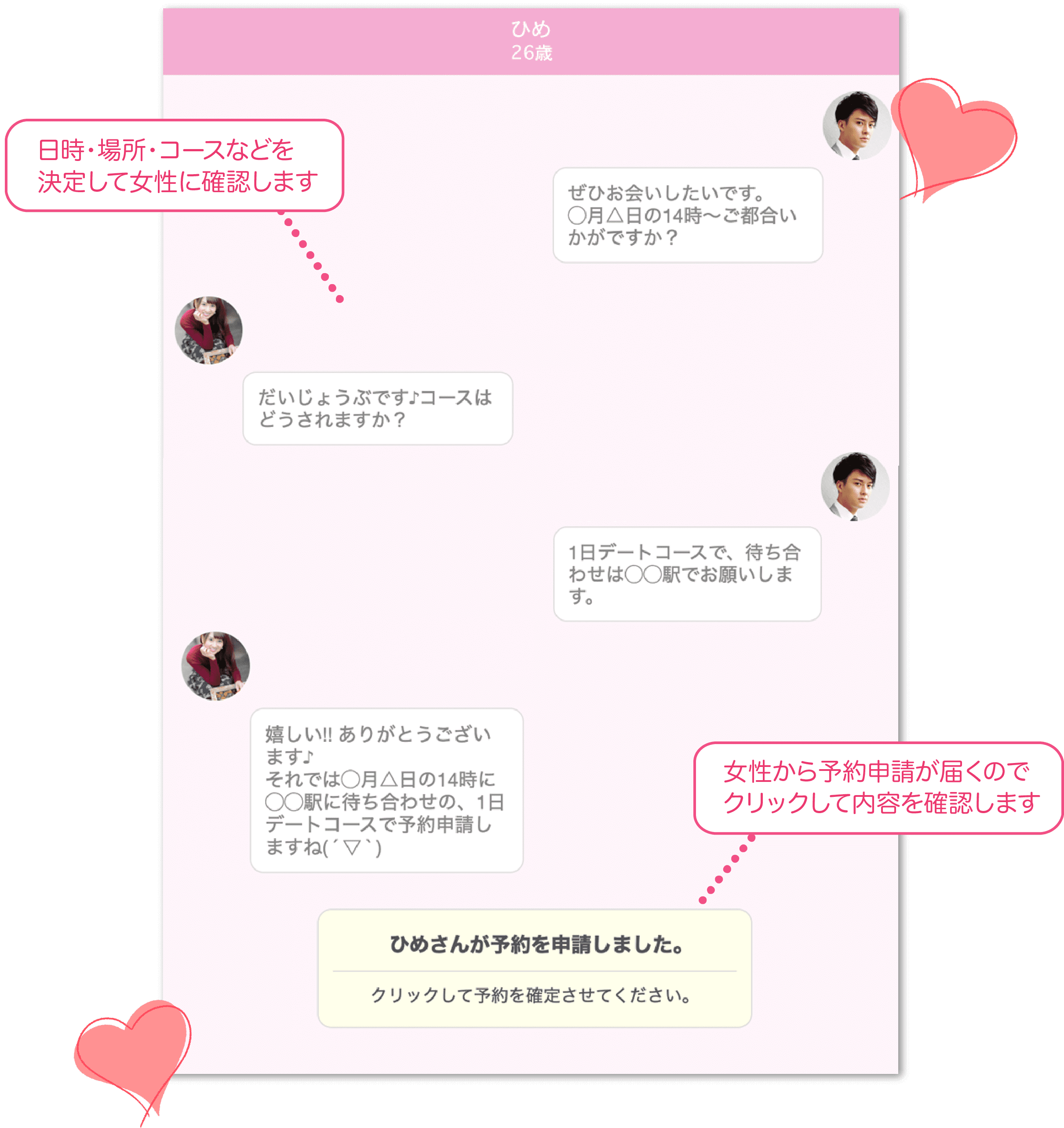 のちに女性からデートの予約申請が届くので、内容を確認して問題がなければ承諾して予約完了☆